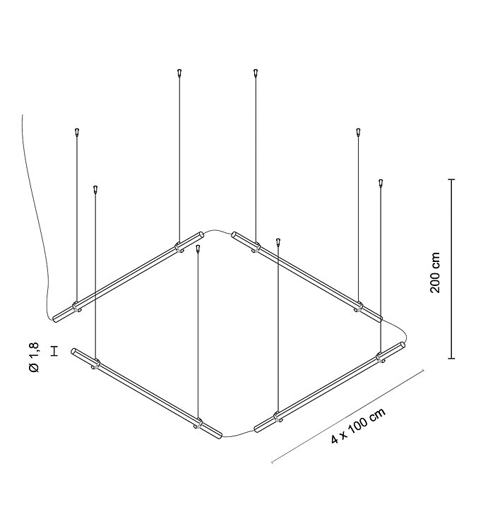 System von vier 100 cm langen Pendelleuchten, verbunden durch ein einziges Koaxialkabel, verstellbar und mit diffusem Licht, mit Aluminium-Druckgussgehäuse, opalem Polykarbonatdiffusor, mit 24V LED-Schaltung, 18W/m und 180 LEDs/m mit CRI>90, ABS-Kappen und transparentem 250 cm Koaxialstromkabel.