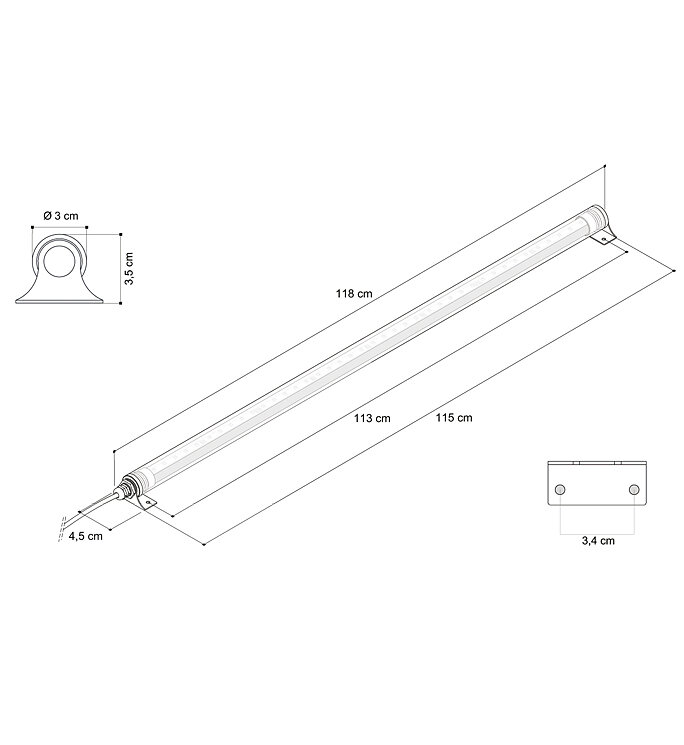 Verstellbarer RGB-Lichtbalken IP67 mit einer Länge von 118 cm mit diffusem Licht, für die Wand- und Deckenmontage, mit Struktur aus transparentem co-extrudiertem Anti-UV-Methacrylat, Klemmen aus Edelstahl AISI 316L und 100 cm Neoprenkabel.