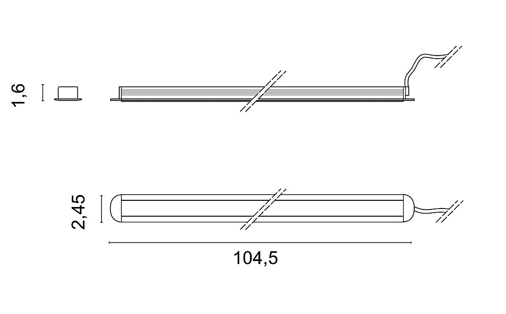 Sehr kleines lineares Profil mit diffusem Licht, integriertem LED-Schaltkreis, Aluminiumstruktur, opaler Polycarbonatscheibe, ABS-Endkappen und 200 cm transparentem Stromkabel.