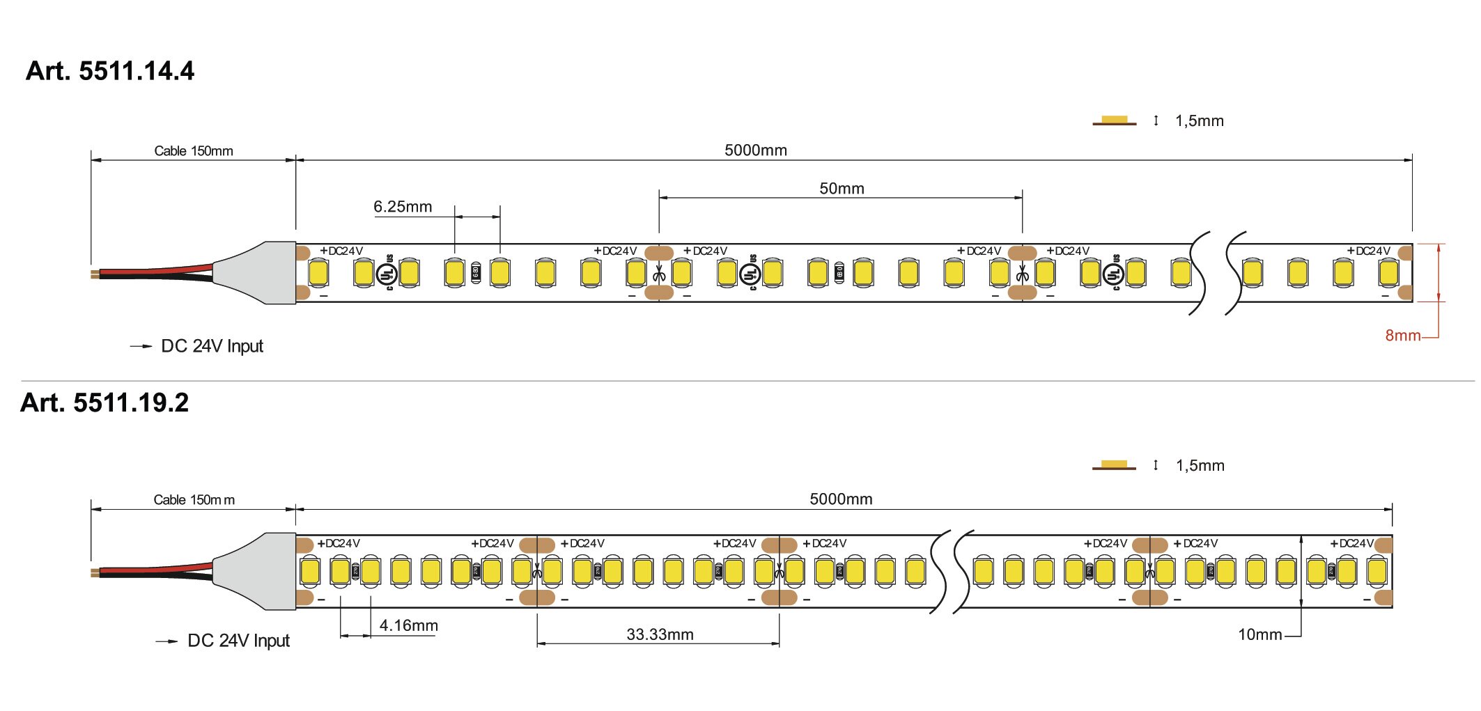 Orderable in 5-meter coils, the product is sectionable every 3.3 cm for the 19.2W LED circuit and every 5 cm for the 14.4W LED circuit.