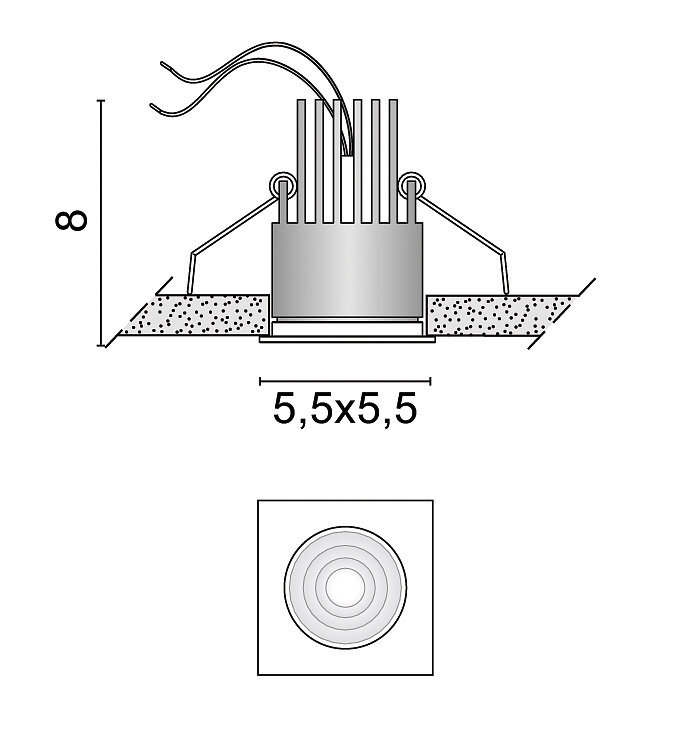 IP54 recessed "mini trim" spotlight for plasterboard ceilings with integrated 500mA LED source, aluminum frame, 38° optical aperture and available with clear or frosted glass front lens.