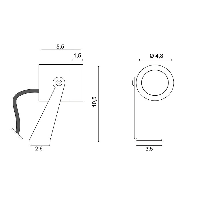 Outdoor adjustable accent light projector with built-in 350mA LED source, different optical apertures, 18°, 40° and 60°, anodized aluminum structure with reinforced outdoor finish, AISI 316L stainless steel bracket and 150cm neoprene cable.