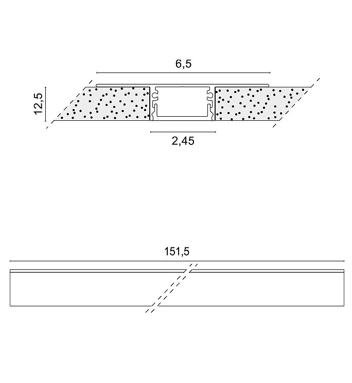 "Totally concealed" recessed aluminum profile for installation on plasterboard false ceilings.