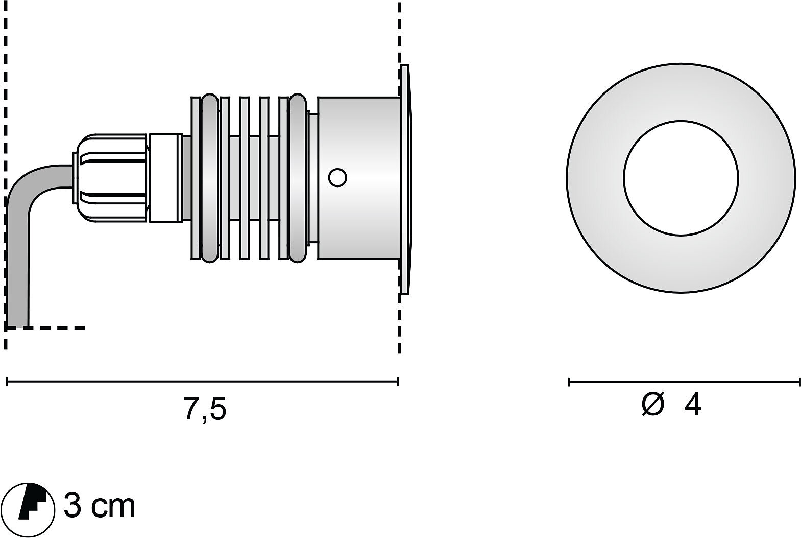 Downlight orientable IP67 con fuente LED de 500 mA integrada, brida de acero inoxidable AISI 316L, disipador de calor de aluminio, pantalla de cristal esmerilado y cable de neopreno de 30 cm.