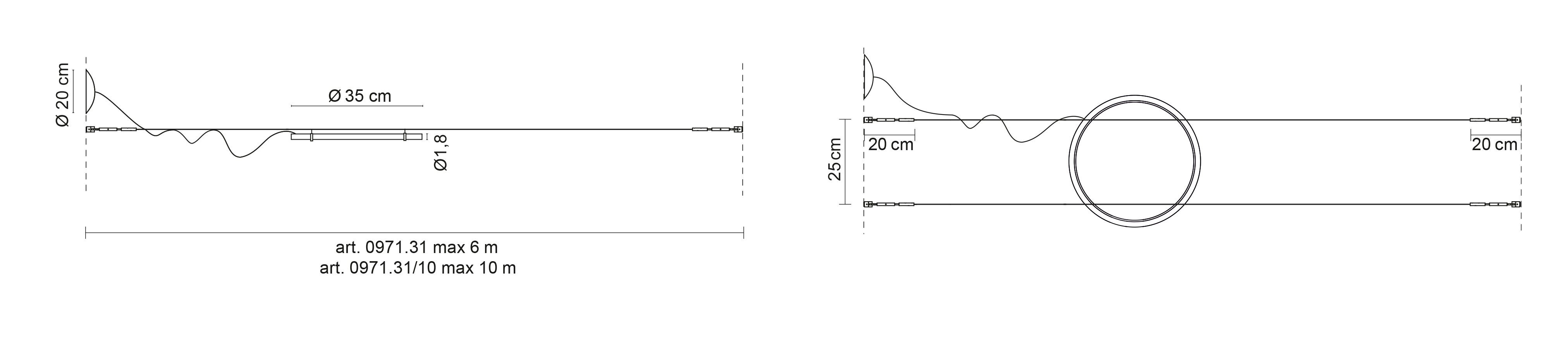 Sur demande, les compositions qui prévoient le raccordement de plusieurs corps avec des câbles d'alimentation allant de lampe en lampe peuvent également être fournies avec des solutions ayant des diamètres de luminaires de 50, 70, 100, 150, 200 et 300 centimètres.
