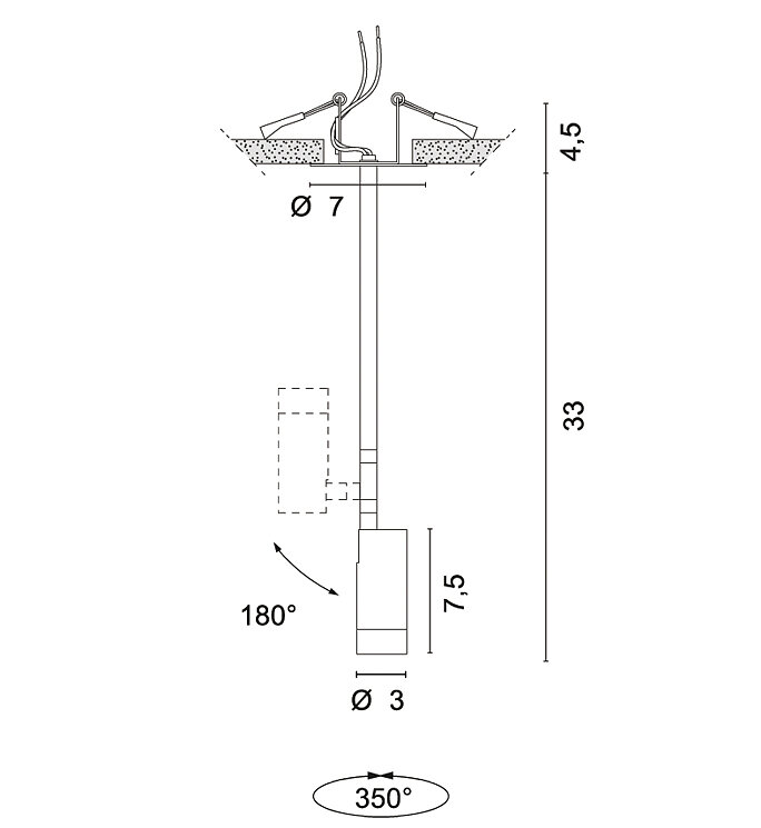 L'iris pivote de 90° sur le plan horizontal et, grâce à la double articulation, de 350° sur l'axe vertical.