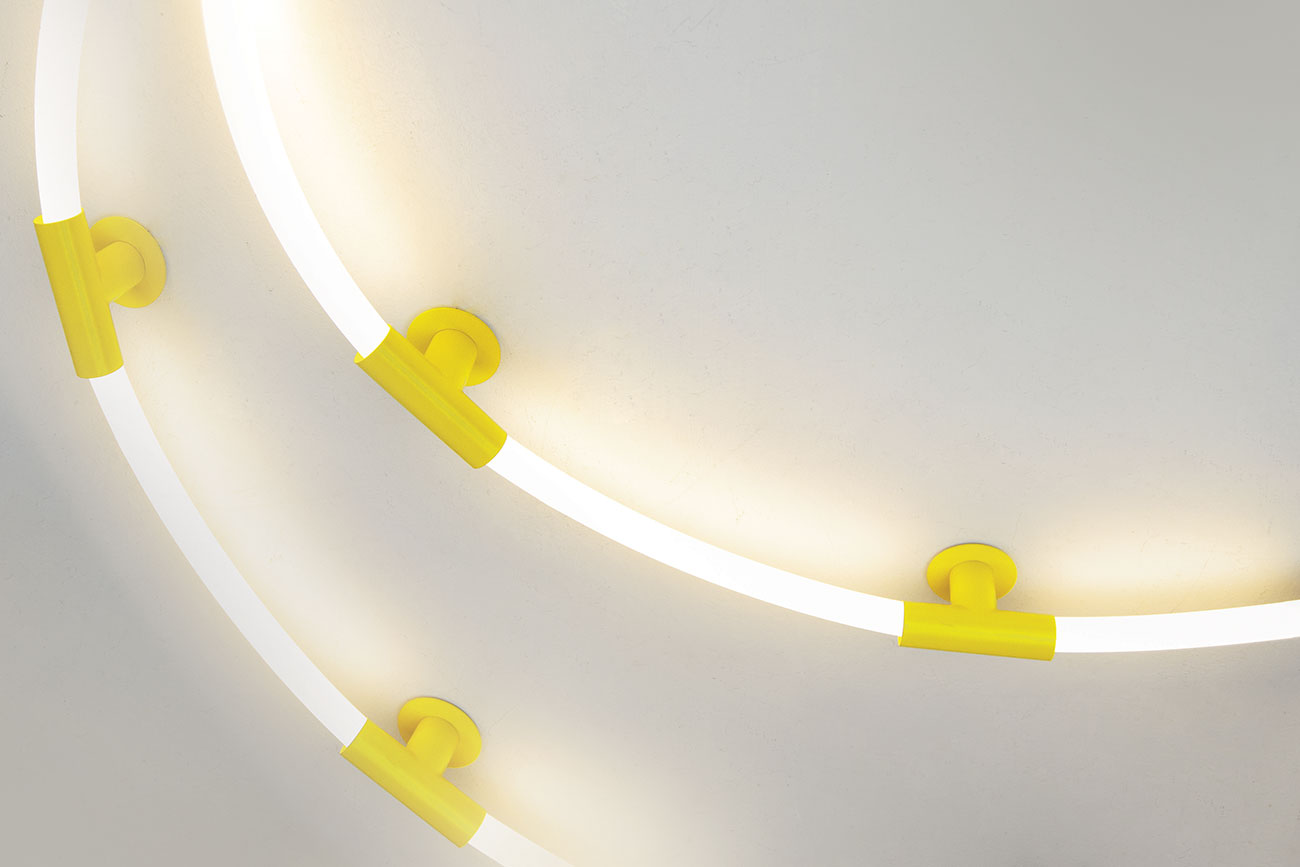 Un esempio particolare di utilizzo delle finiture colorate è il nuovo il sistema di illuminazione Anaconda. Questo innovativo sistema da parete, plafone e sospensione è caratterizzato dalla modellabilità del corpo tubolare in silicone e dalla luce diffusa e confortevole a 360 gradi.