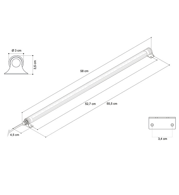 Barra luminosa RGB orientabile IP67 con lunghezza di 58 centimetri a luce diffusa, per installazione a parete e soffitto, con circuito LED a 24V, struttura in metacrilato trasparente coestruso anti-UV, terminali in acciaio inox AISI 316L e cavo in neoprene da 100 centimetri.