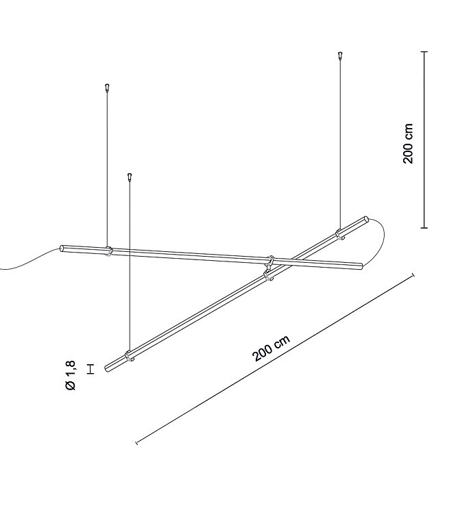 Система из двух подвесных светильников длиной 200 см, соединенных одним коаксиальным кабелем, регулируемый и рассеянный свет, опаловый рассеиватель из поликарбоната, светодиодная схема 24V, 18W/m и 180 LEDs/m с CRI>90, колпачки ABS и прозрачный коаксиальный кабель питания длиной 250 см.