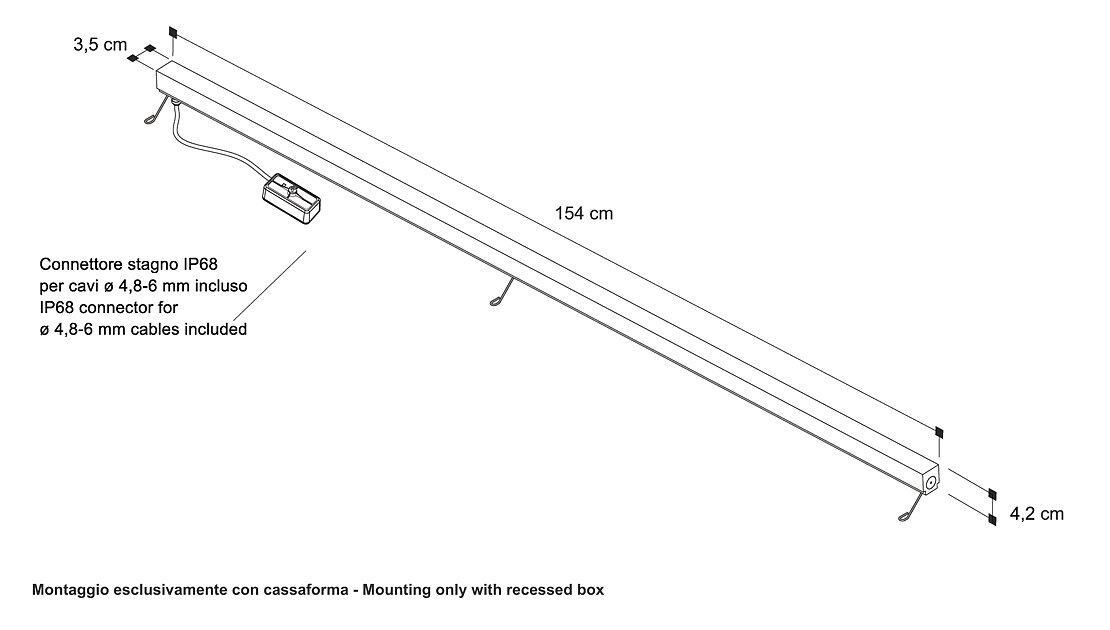 Прогулочная модульная система для наружного освещения со степенью защиты IP67 и IK10: корпус из прозрачного коэкструдированного метакрилата, рассеивающая часть из опалина, опалубка и торцевые крышки из анодированного алюминиевого литья под давлением с усиленной обработкой наружным анодированием.